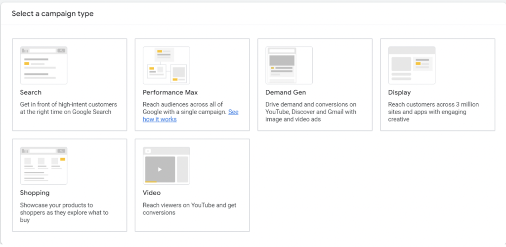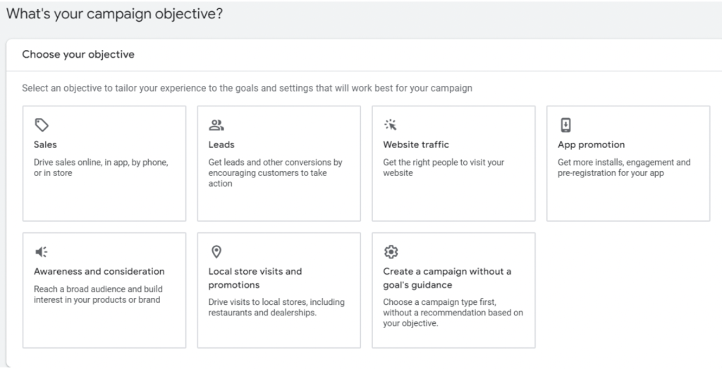 Before starting to set up a Google Ads campaign, identify the goal of your campaign. Are you looking to increase sales, drive website traffic, or generate leads? Understanding your search engine marketing strategy will guide every decision moving forward, including keyword selection, ad copy, and bid strategy. Here you can see campaign objectives.